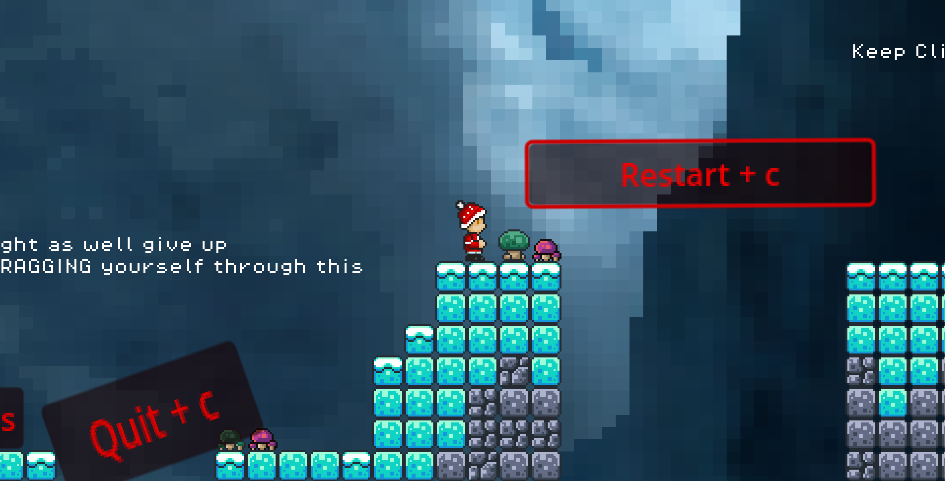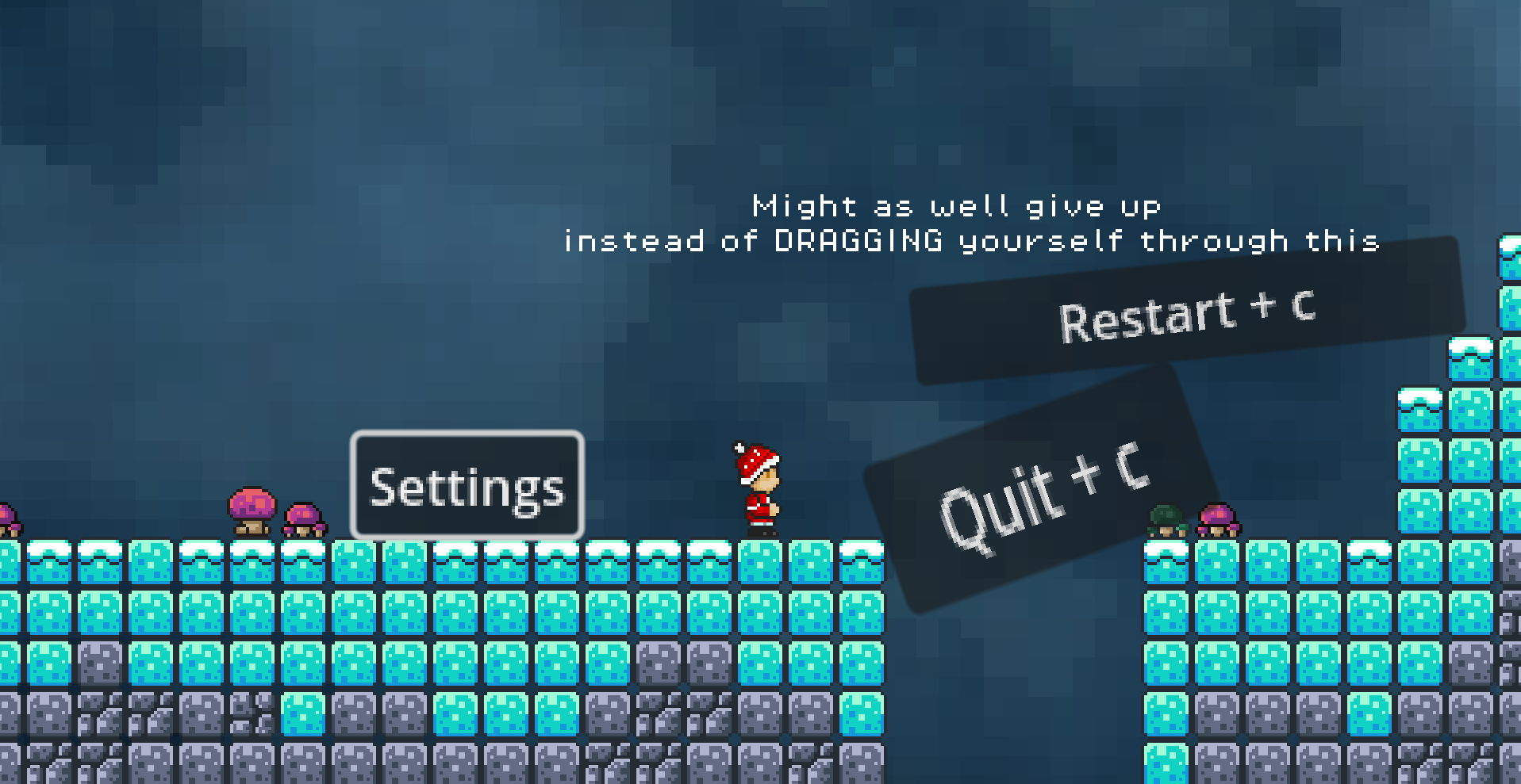 Press the Escape key on your keyboard to spawn the menu buttons which you can use as platforms that you can place around the level progress. When the boxes are red, you are able to move them with your mouse and when you click escape again you are able to use them as walkable platforms.